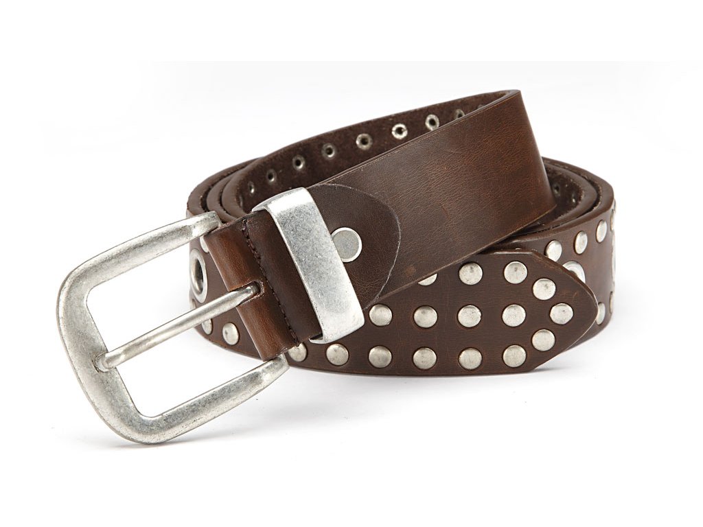 Opasek z kvalitní vrstvené přírodní a umělé kůže hnědý zdobený cvoky.