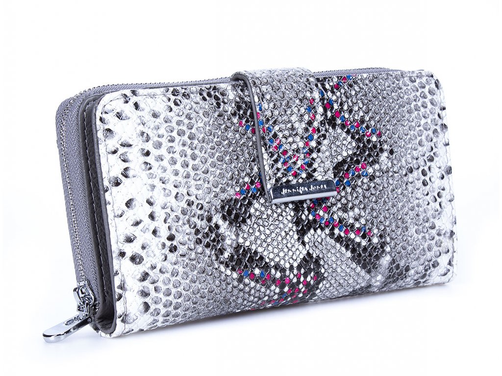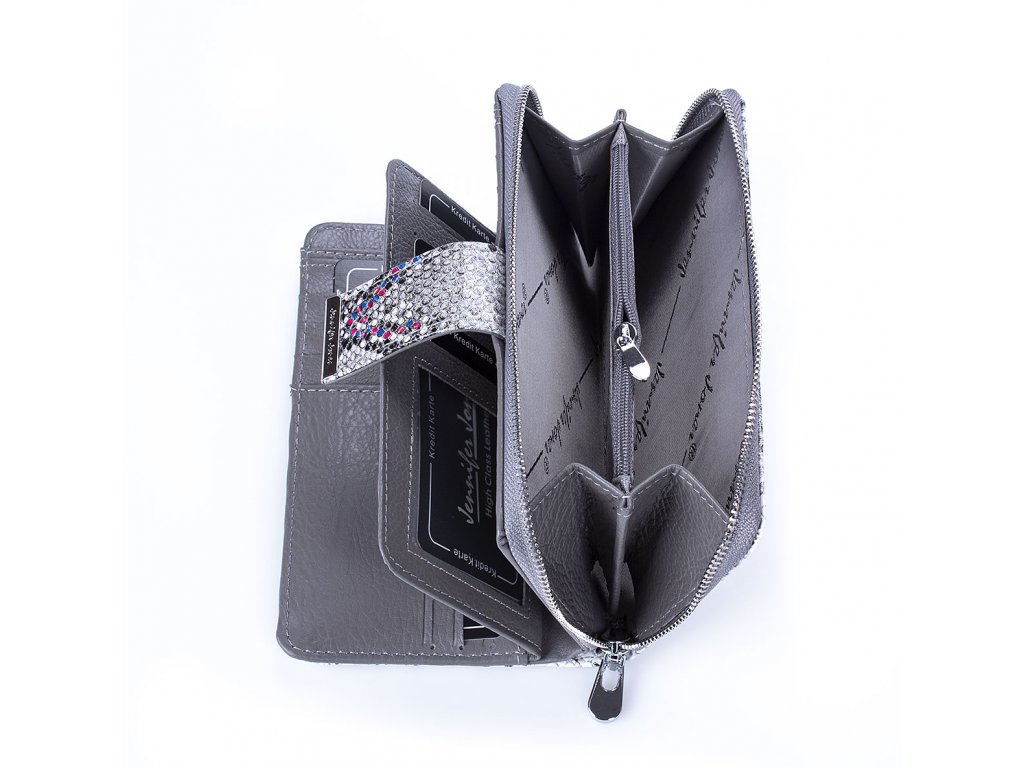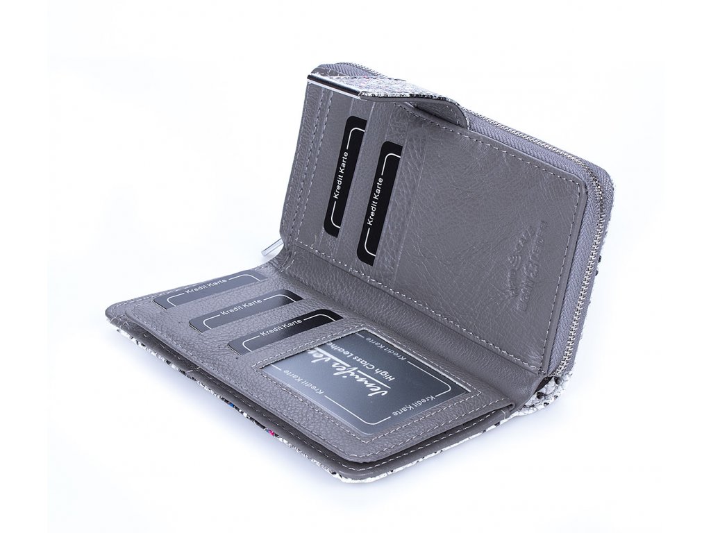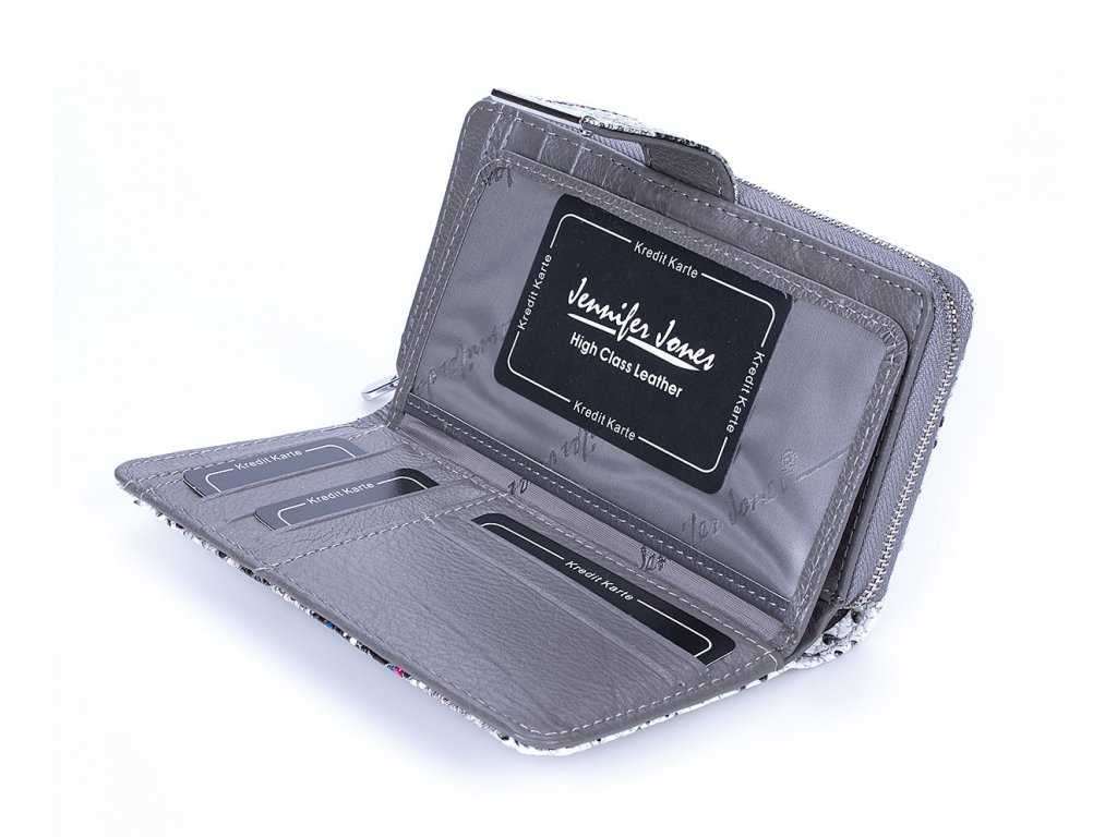 Oblíbená dámská kožená peněženka Jennifer Jones šedá. Z vnější strany je kůže lakovaná s jemnou strukturou krokodýlí kůže a jemným červeno modrým vzorem. Peněženka je dostupná ve více barevných variantách které naleznete ZDE. Praktická velikost a vnitřní uspořádání peněženky.