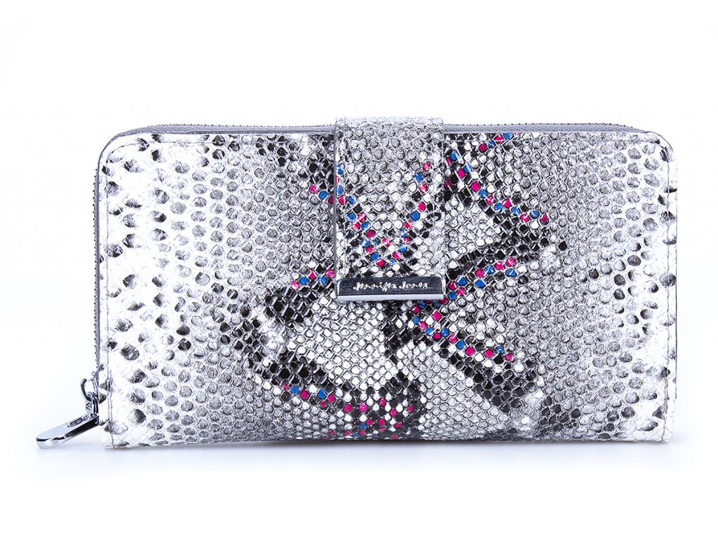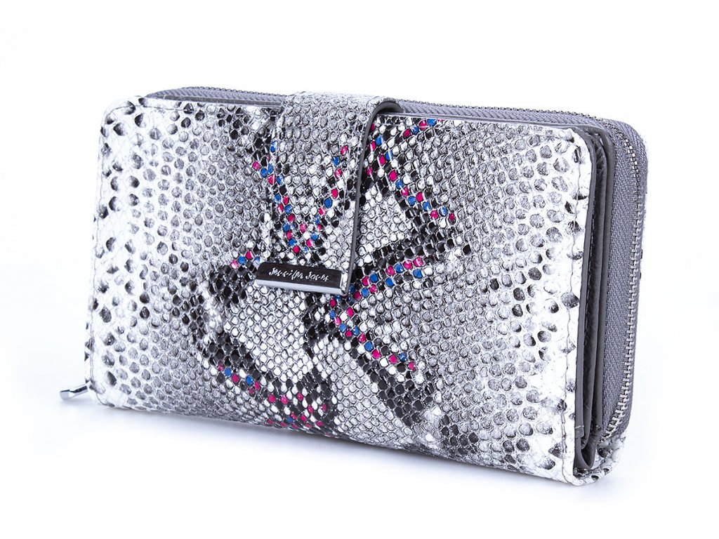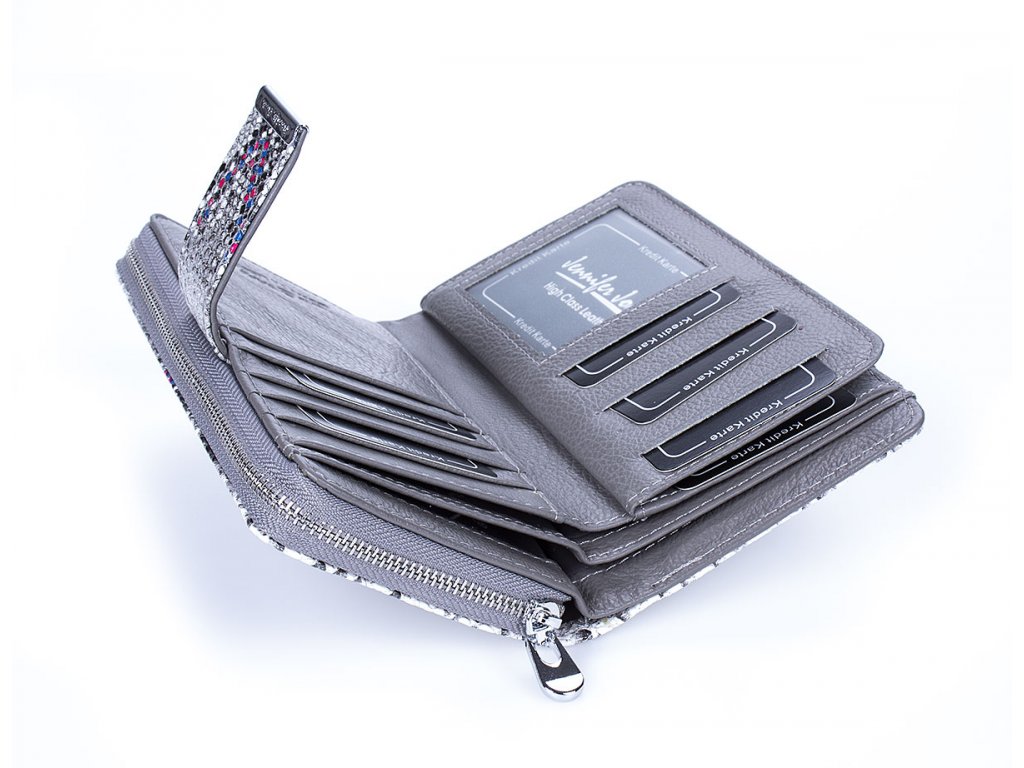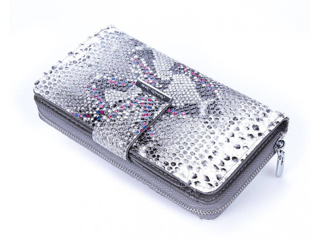 Oblíbená dámská kožená peněženka Jennifer Jones šedá. Z vnější strany je kůže lakovaná s jemnou strukturou krokodýlí kůže a jemným červeno modrým vzorem. Peněženka je dostupná ve více barevných variantách které naleznete ZDE. Praktická velikost a vnitřní uspořádání peněženky.