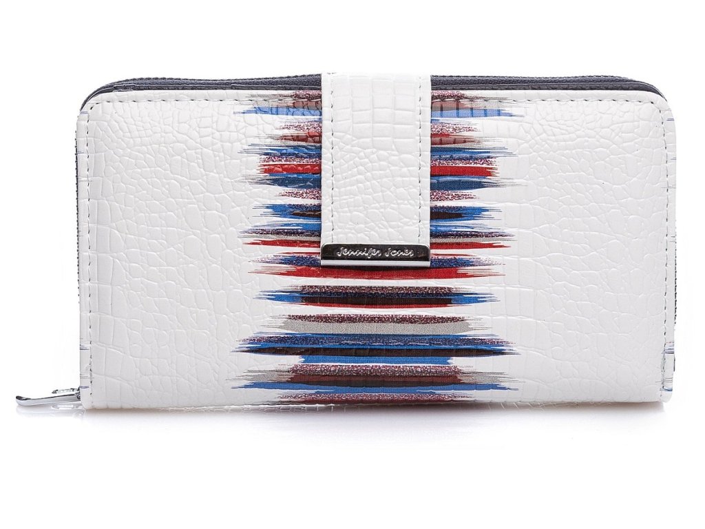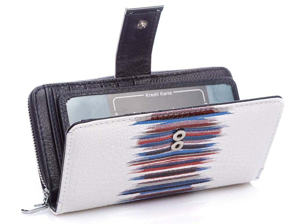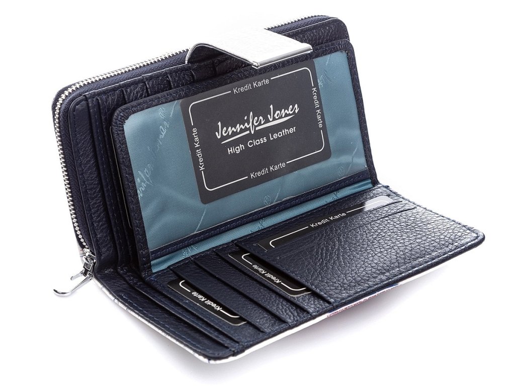 Elegantní dámská kožená peněženka z kolekce Jennifer Jones s s modro-červeným žíháním. KAŽDÁ PENĚŽENKA JE ORIGINÁL modro-červené žíhání je na každé peněžence umístěné v jiné poloze. Přírodní kůže z vnější strany lakovaná. Peněženka je dostupná ve více barevných variantách které naleznete ZDE.