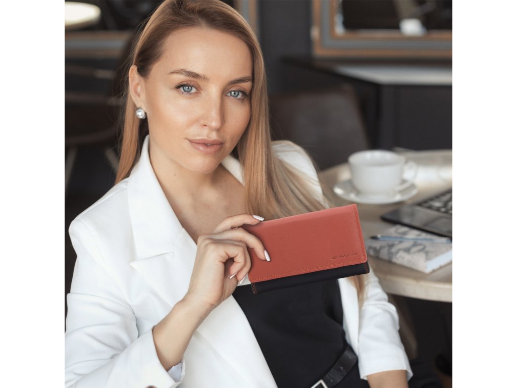 Dámská kožená peněženka značky Dargelis, kolekce CAUS v barevné kombinaci černo-hnědá. Velká dělená přihrádka na mince uzavíratelná na zip. Praktická velikost peněženky se spoustou přihrádek. Kvalitní přírodní kůže. Ochrana RFID Safe.