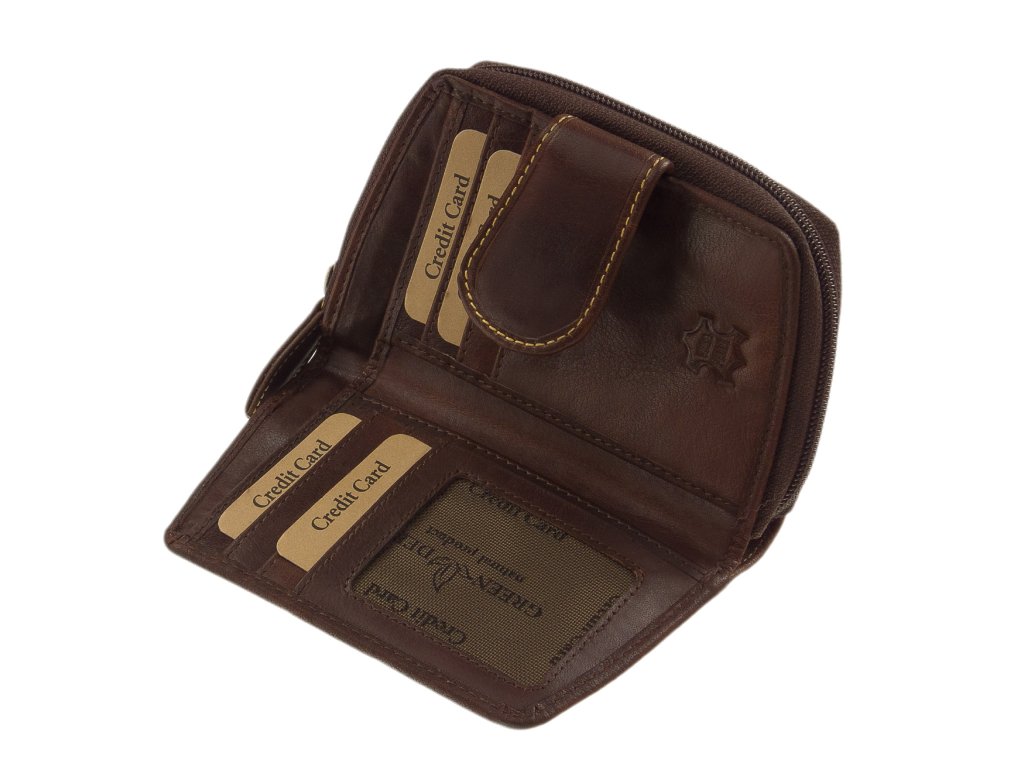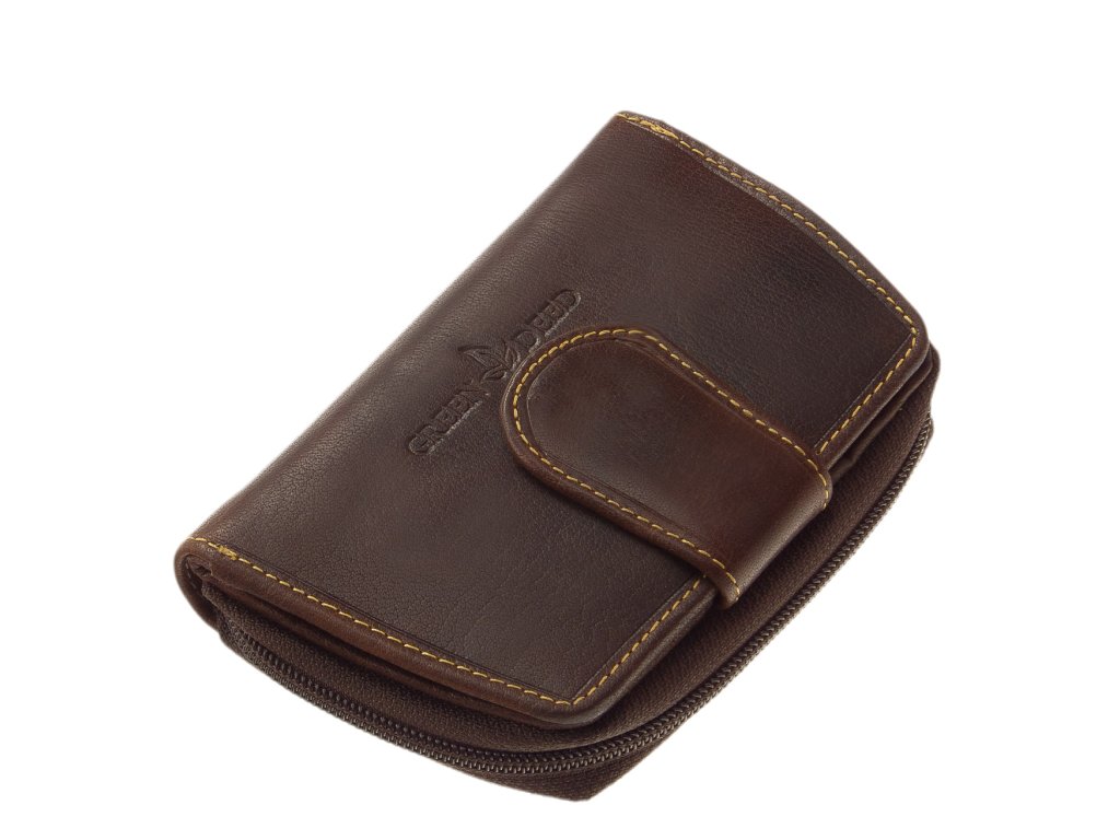 Dámská peněženka z pravé přírodní kůže Green Deed tmavě hnědá. Tato značková dámská kožená peněženka kombinuje materiály prémiové kvality a praktické vnitřní uspořádání. Dvojitá přepínací spona umožňuje bezpečné a flexibilní uzavření, i když je peněženka plná. Samostatná přihrádka na mince na zip – přihrádku na mince lze použít, aniž byste museli otevírat celou peněženku. Rozměry peněženky a popis vnitřního uspořádání jsou uvedeny v detailním popisu.
