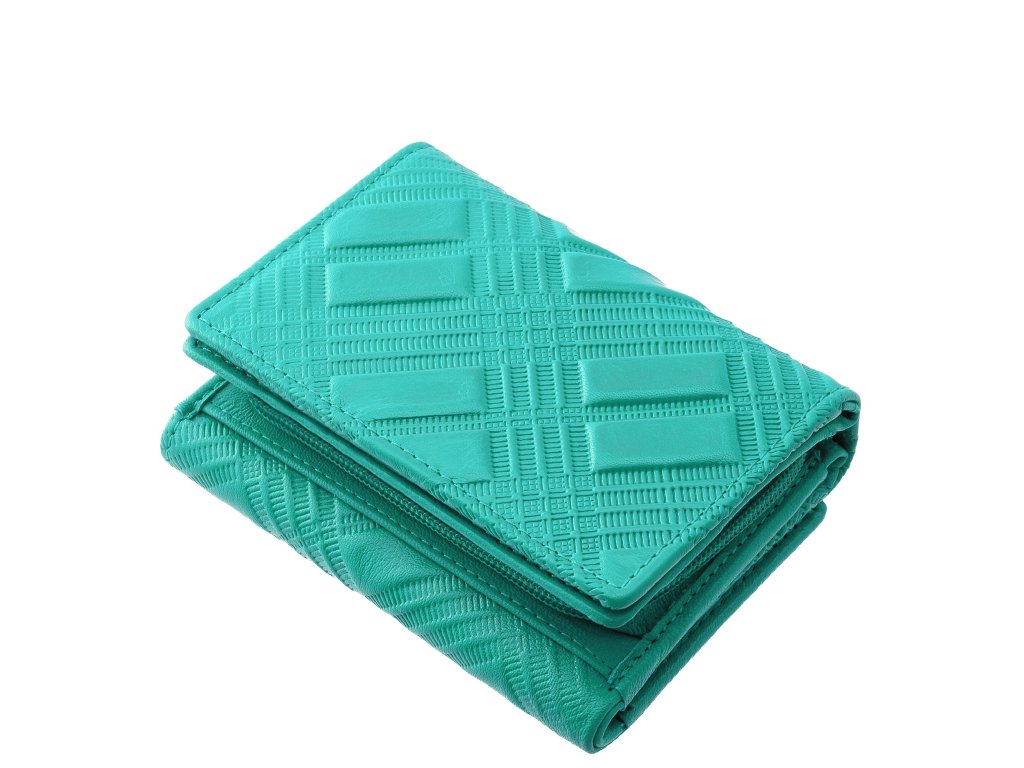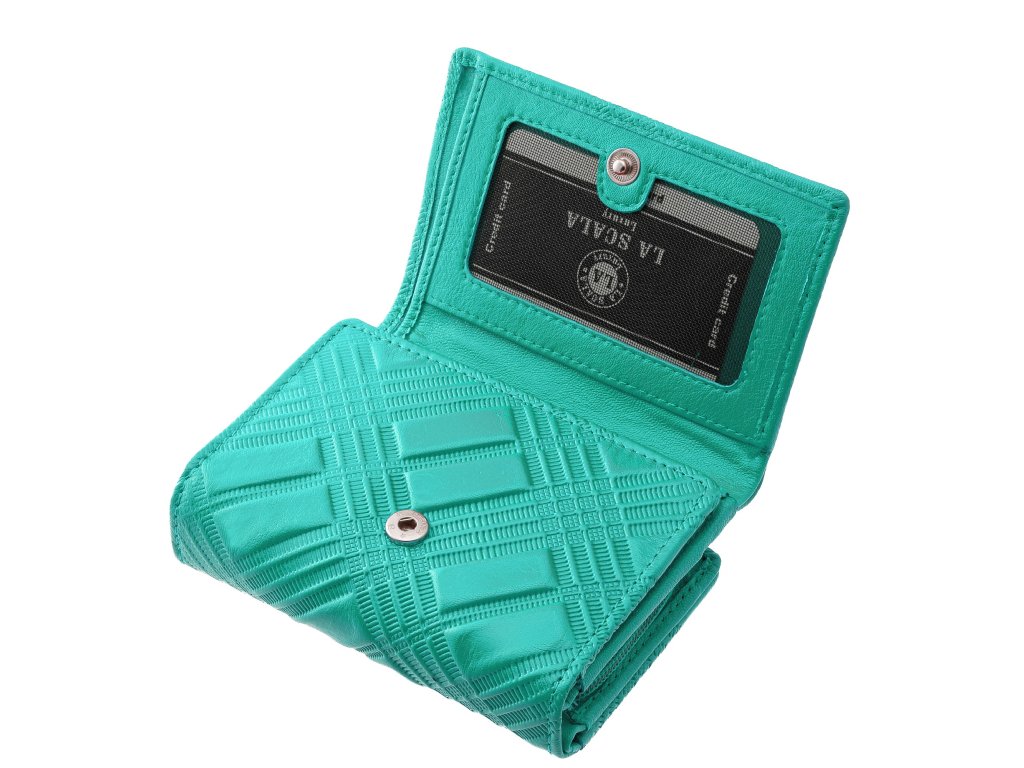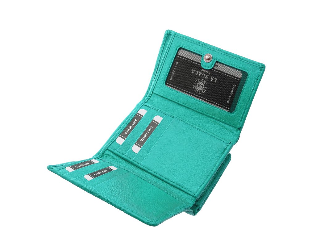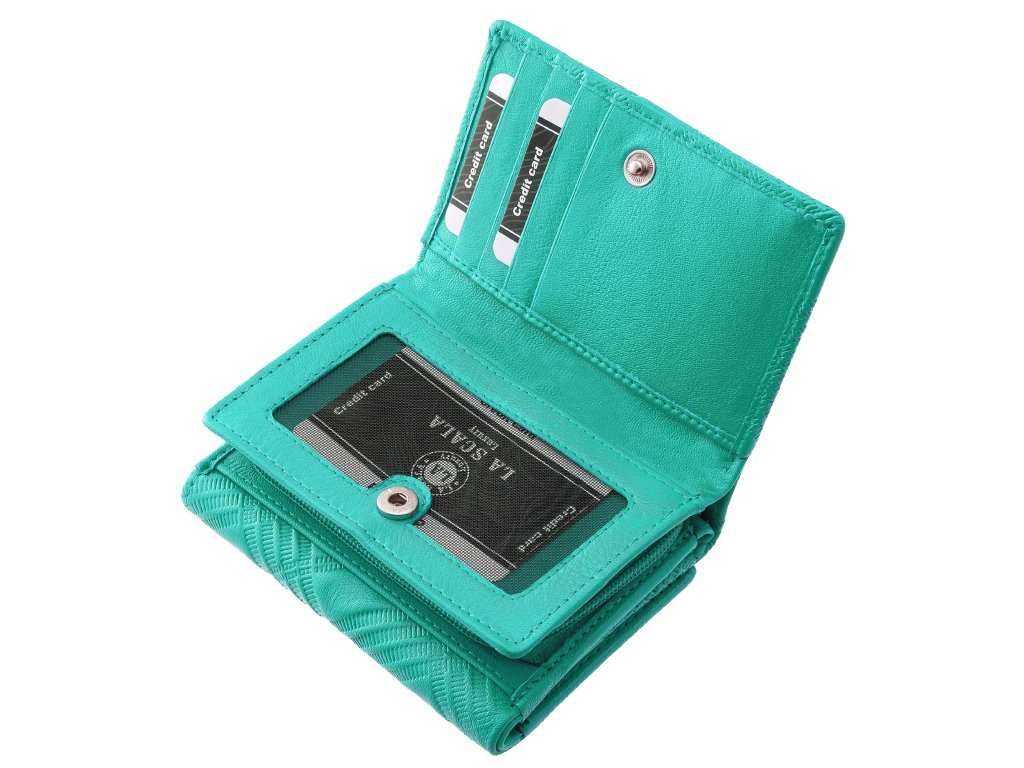 Dámská peněženka z jemné přírodní kůže La Scala tyrkysová. Rozkládací styl a praktické vnitřní uspořádání. Jemný embosovaný vzor na povrchu peněženky. Dostupné barevné varianty této dámské peněženky naleznete ZDE. Samostatná přihrádka na mince na zip. Přihrádku na mince lze použít, aniž byste museli otevírat celou peněženku.