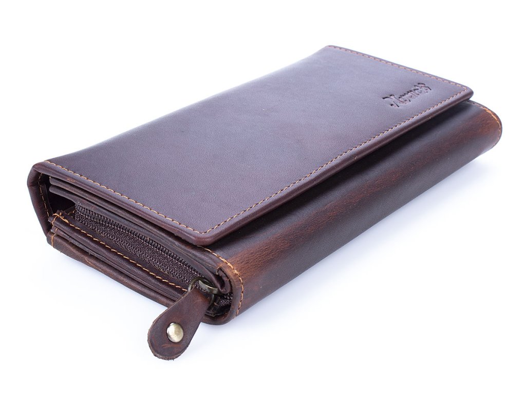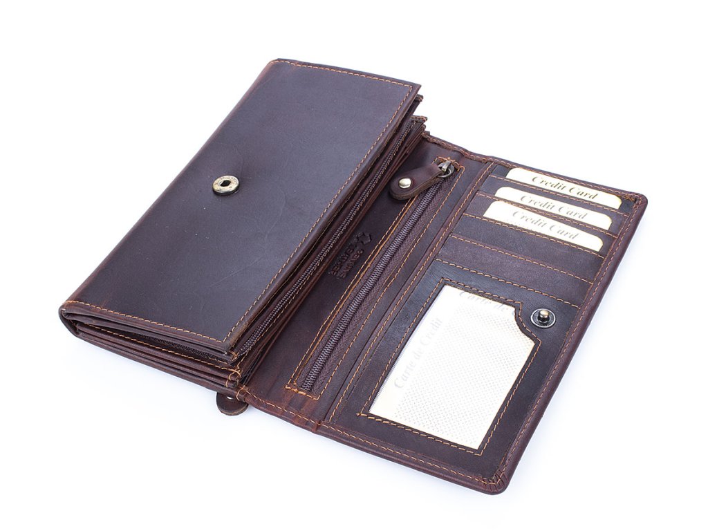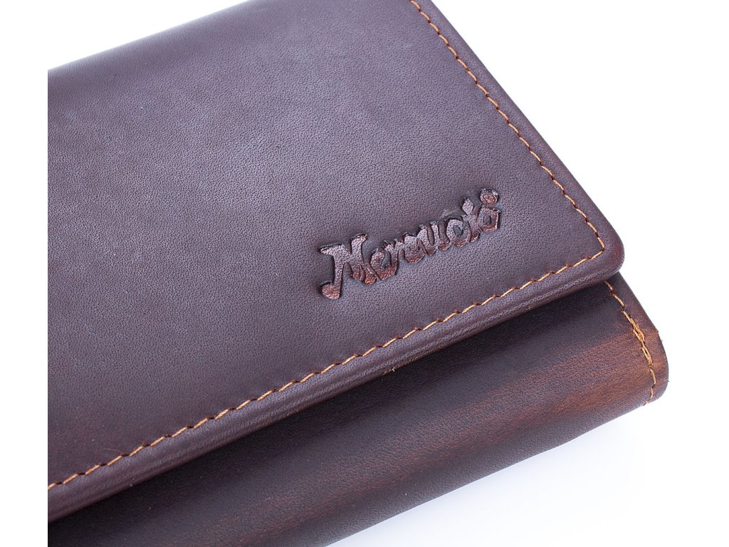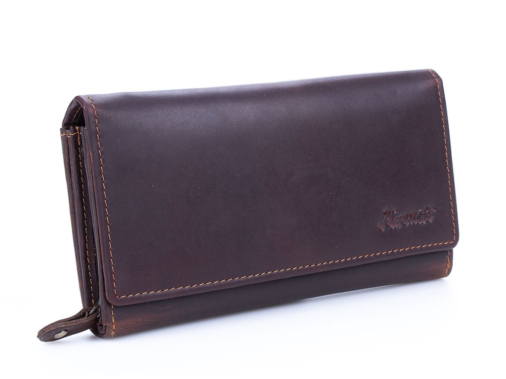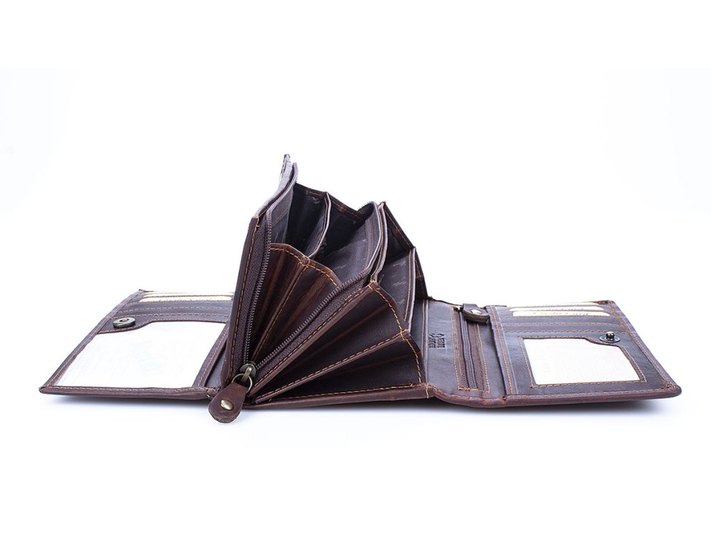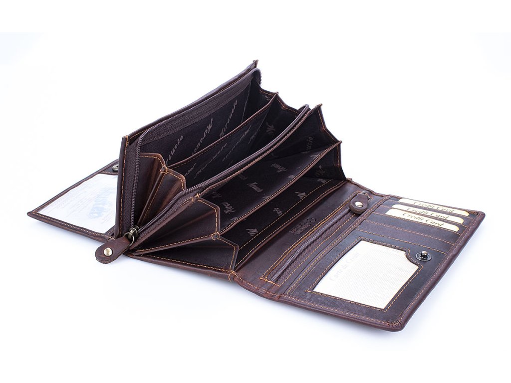 Prostorná dámská kožená peněženka tmavě hnědá z kolekce Mercucio. Kvalitní hovězí přírodní hovězí kůže s povrchovou úpravou Hunter. Dělená přihrádka na mince uzavíratelná na zip. Samostatné oddělení na karty uzavíratelné na patentek. Oblíbená velikost a vnitřní uspořádání peněženky.