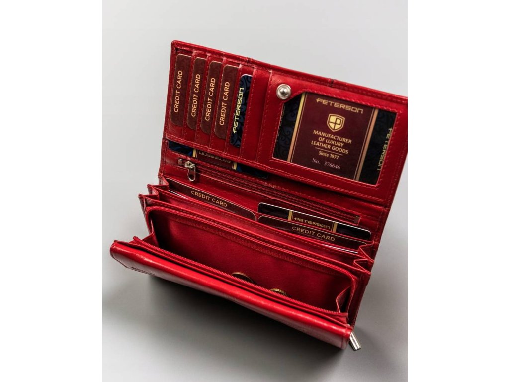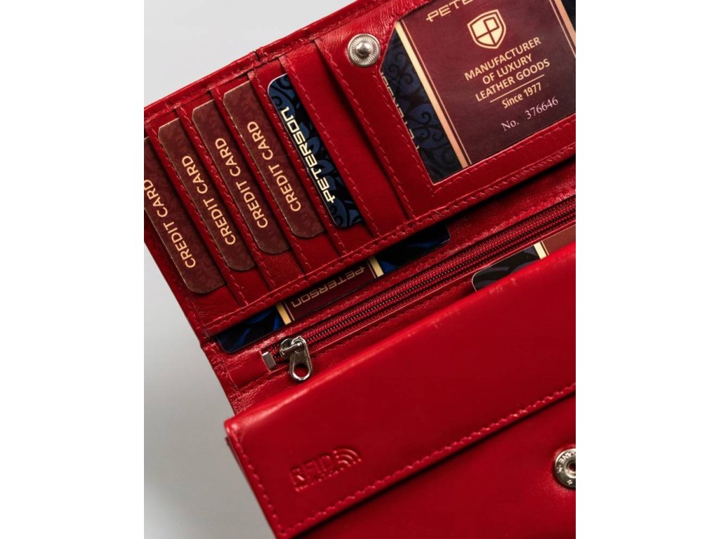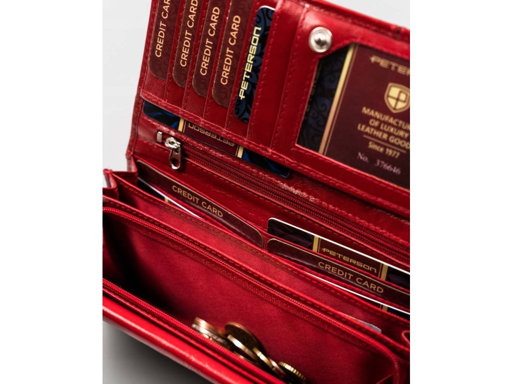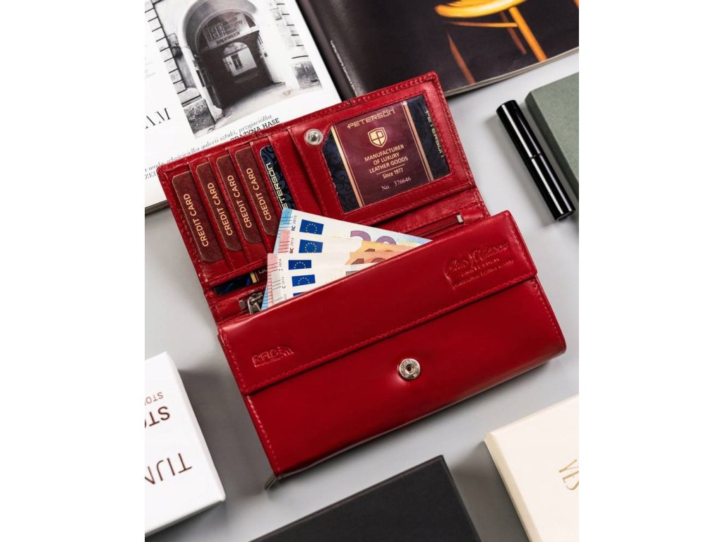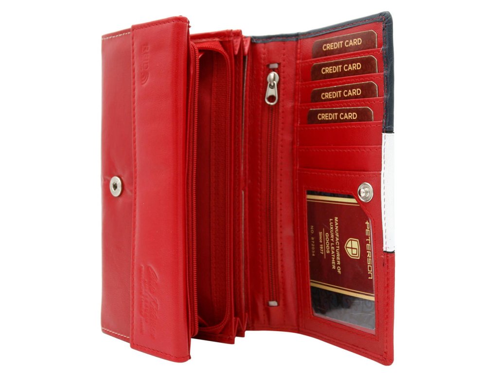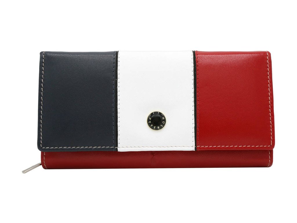 Středně velká dámská kožená peněženka Peterson červená multicolor (modrá+bílá+červená). Kvalitní přírodní kůže a oblíbené vnitřní uspořádání peněženky. Peněženka balena v dárkové krabičce. Přihrádka na mince na zip a na patentek. Ochrana RFID Secure. Tato dámská peněženka je dostupná ve více barvách které naleznete ZDE.