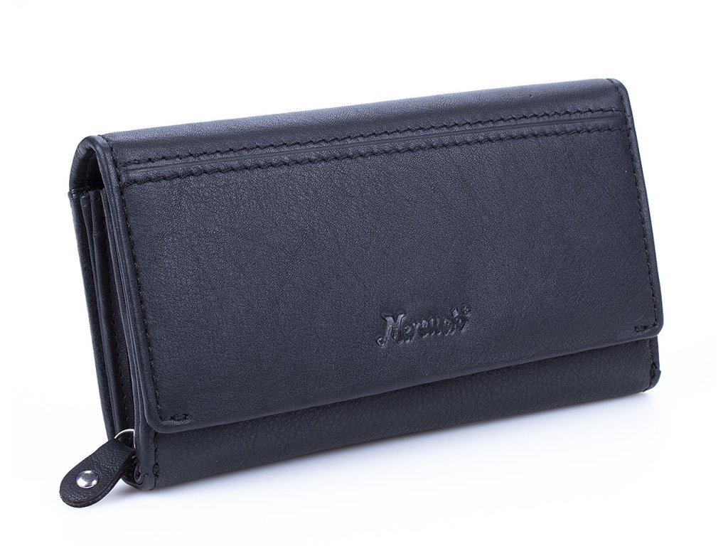 Prostorná dámská kožená peněženka Mercucio černá. Kvalitní přírodní hovězí kůže s povrchovou úpravou Nappa. Oblíbené vnitřní uspořádání peněženky a precizní zpracování. Velká samostatná přihrádka na mince dělená uzavíratelná na zip. Tato peněženka je dostupná ve více barvách které naleznete ZDE.