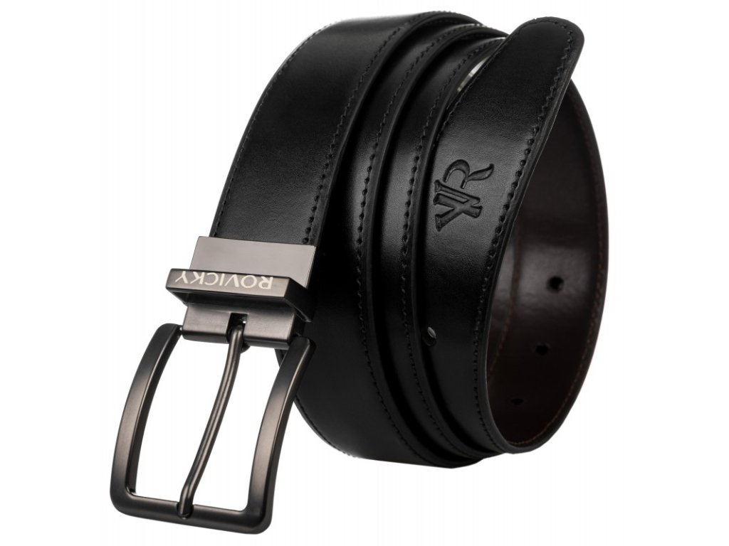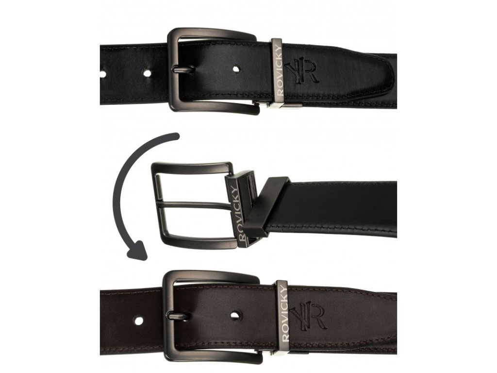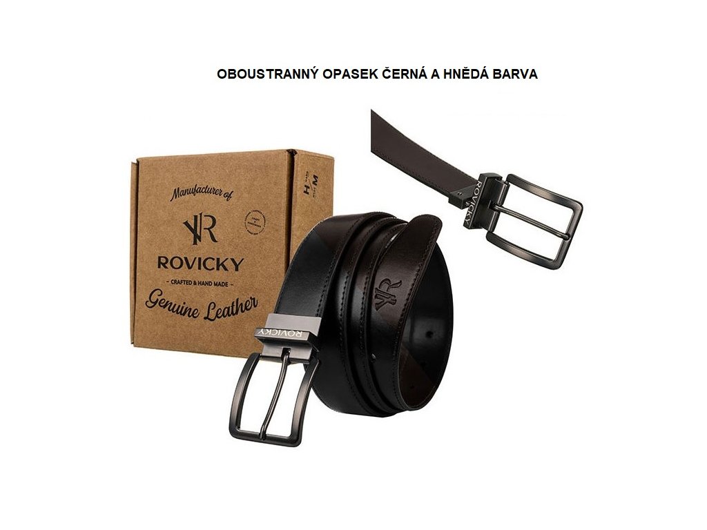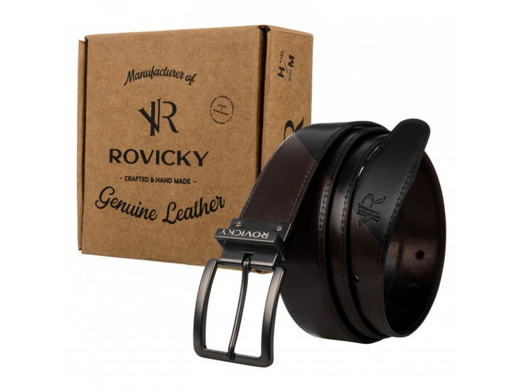 Pánský oboustranný černý-hnědý kožený opasek Rovicky. Pomocí otočné přezky můžete změnit barvu opasku dle vaší aktuální potřeby. Budete mít opasek černý nebo hnědý. Přezka otočná niklová střední velikost 6 x 5 cm. Šířka opasku 3,5 cm. Jedno pevné poutko na přezce. Opasek je balen v dárkové krabičce.