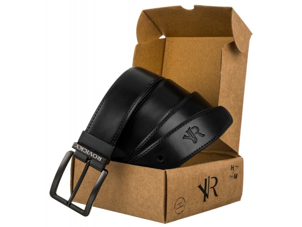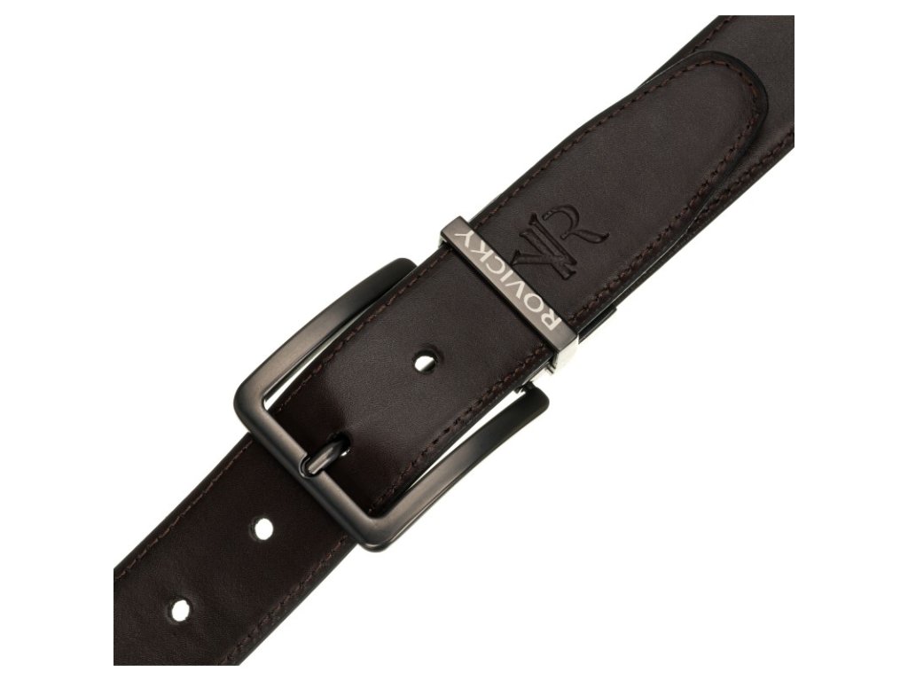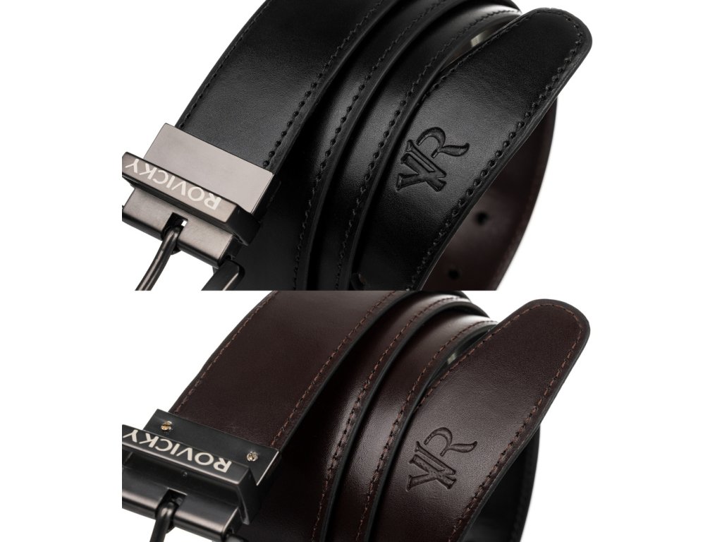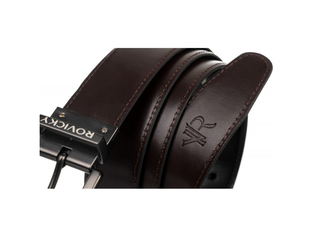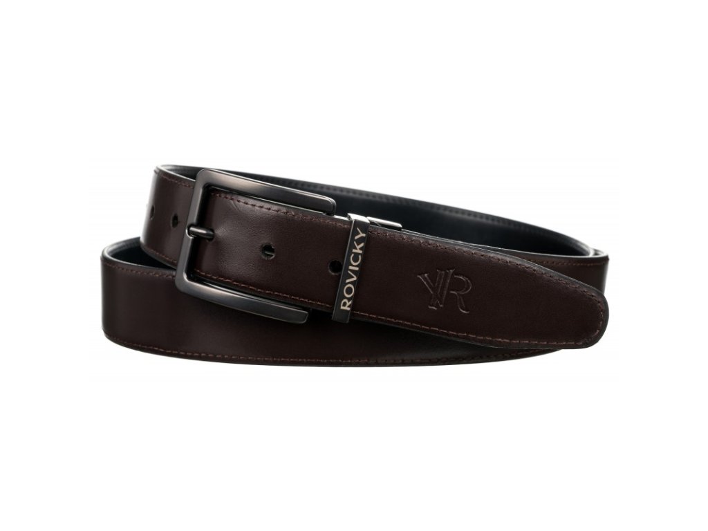 Pánský oboustranný černý-hnědý kožený opasek Rovicky. Pomocí otočné přezky můžete změnit barvu opasku dle vaší aktuální potřeby. Budete mít opasek černý nebo hnědý. Přezka otočná niklová střední velikost 6 x 5 cm. Šířka opasku 3,5 cm. Jedno pevné poutko na přezce. Opasek je balen v dárkové krabičce.