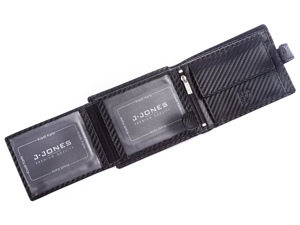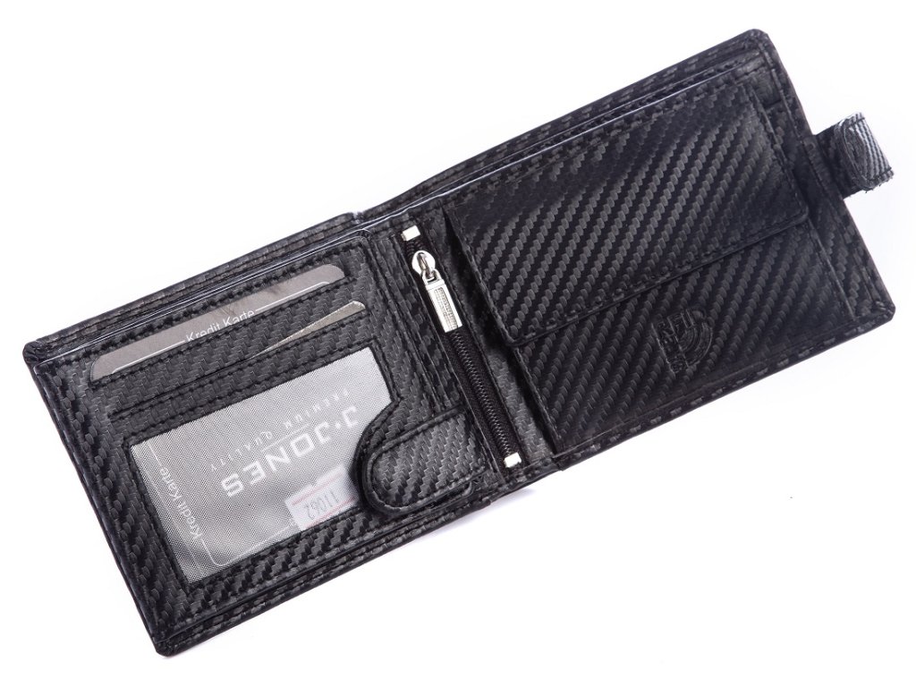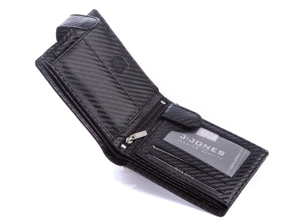 Pánská peněženka J.Jones černá uzavíratelná koženým páskem na patentek orientované na šířku. Oblíbený model pánské peněženky. Kvalitní umělá kůže a precizní zpracování. Ochrana RFID Secure.
