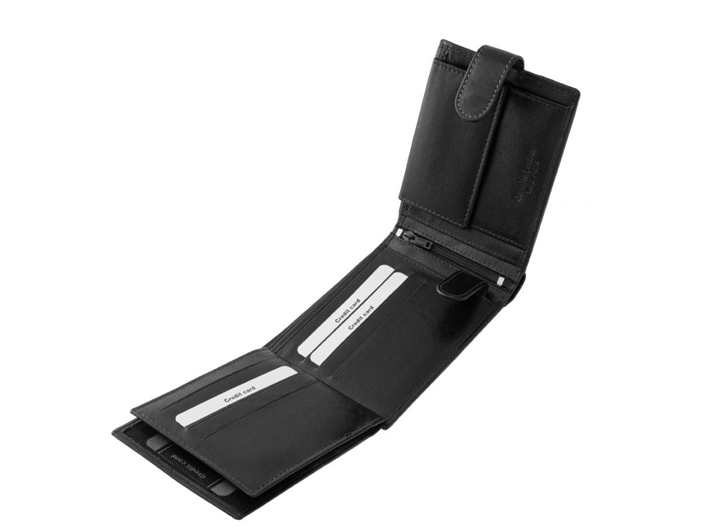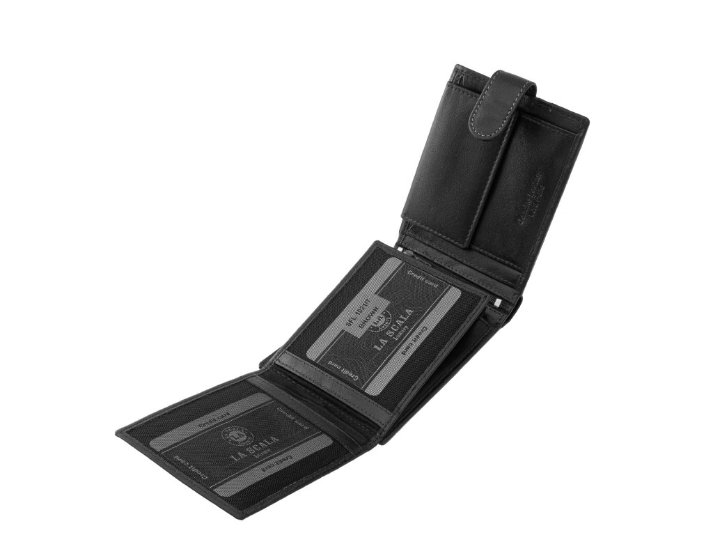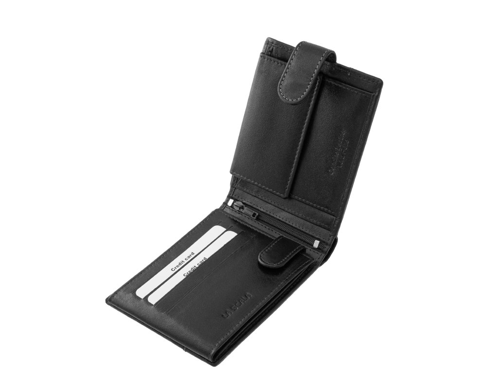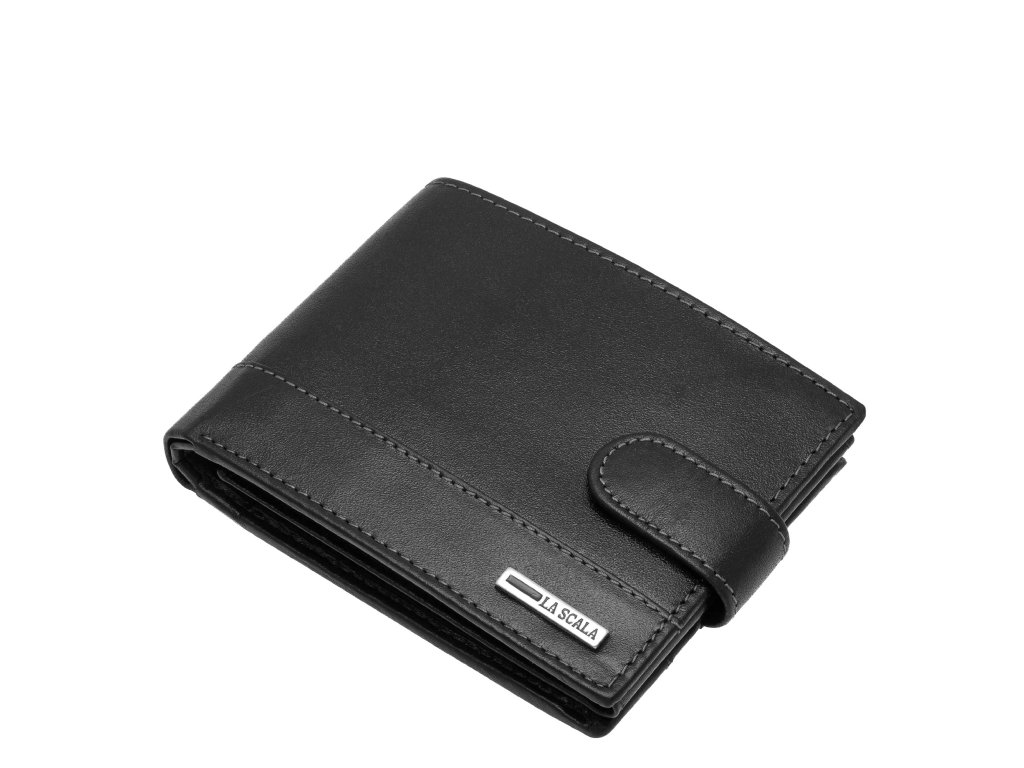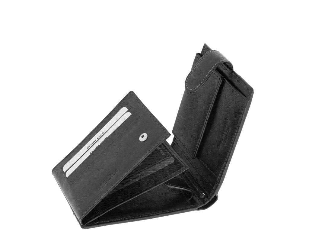 Pánská kožená peněženka La Scala černá s přepínacím koženým páskem na patentek Oblíbená velikost a vnitřní uspořádání pánské peněženky. Kvalitní přírodní kůže a precizní zpracování. Ozdobní prošití a kovové logo La Scala. Peněženka je dostupná ve více barvách ZDE. Rozměry peněženky a popis vnitřního uspořádání jsou uvedeny v detailním popisu.