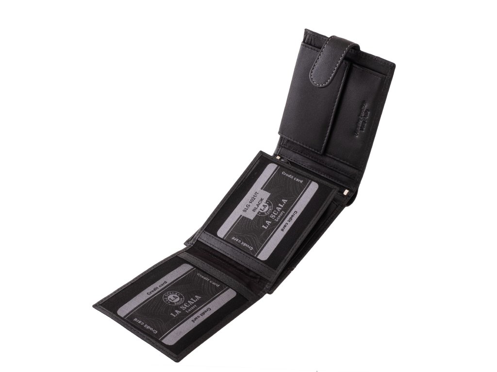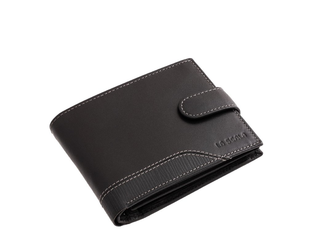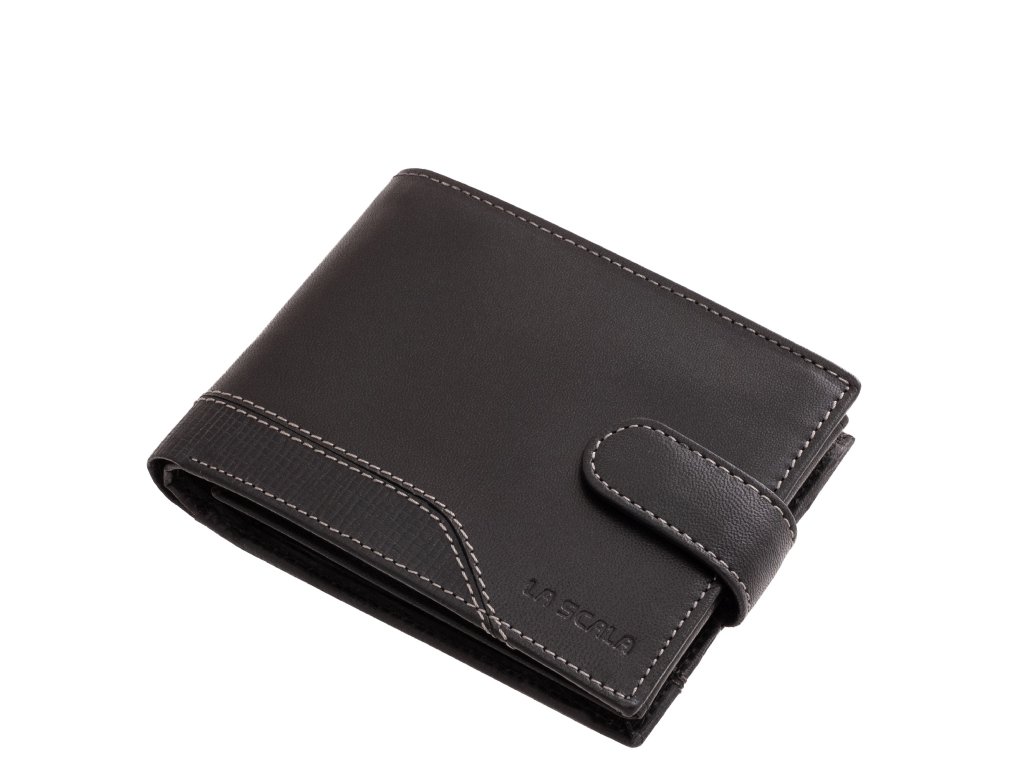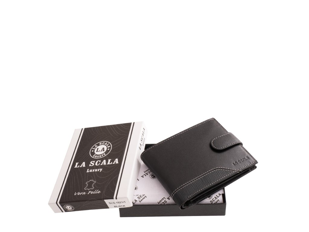 Pánská kožená peněženka La Scala černá. Peněženka je orientovaná na šířku a je uzavřena koženým páskem na patentek. Oblíbená velikost a vnitřní uspořádání pánské peněženky. Kvalitní přírodní kůže pololesklá. Precizní zpracování a kvalitní šití. Baleno v dárkové krabičce. Tato pánská peněženka je dostupná ve více barvách které naleznete ZDE.