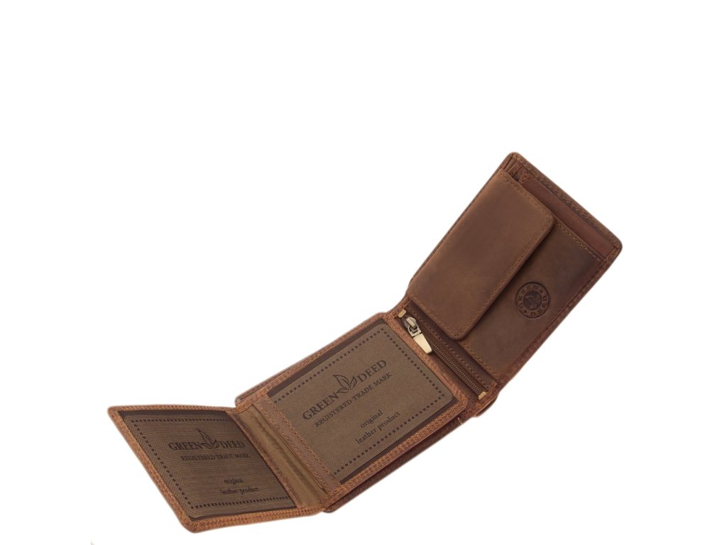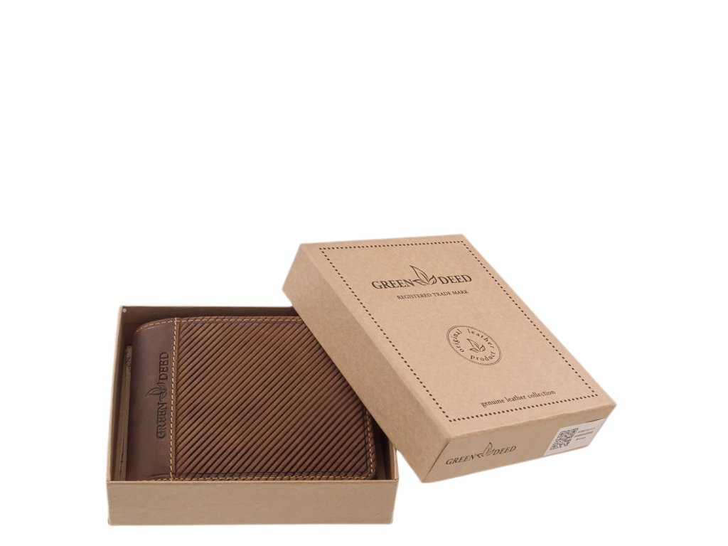 Pánská kožená peněženka Green Deed hnědá. Oblíbená velikost a vnitřní uspořádání pánské peněženky. Kvalitní přírodní hovězí kůže a precizní zpracování. Baleno v dárkové krabičce.