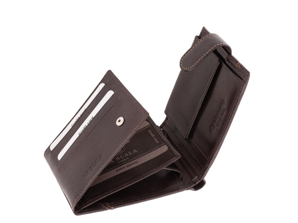 Pánská kožená peněženka La Scala hnědá. Peněženka je orientovaná na šířku a je uzavřena koženým páskem na patentek. Oblíbená velikost a vnitřní uspořádání pánské peněženky. Kvalitní přírodní kůže pololesklá. Precizní zpracování a kvalitní šití. Baleno v dárkové krabičce. Tato pánská peněženka je dostupná ve více barvách které naleznete ZDE.