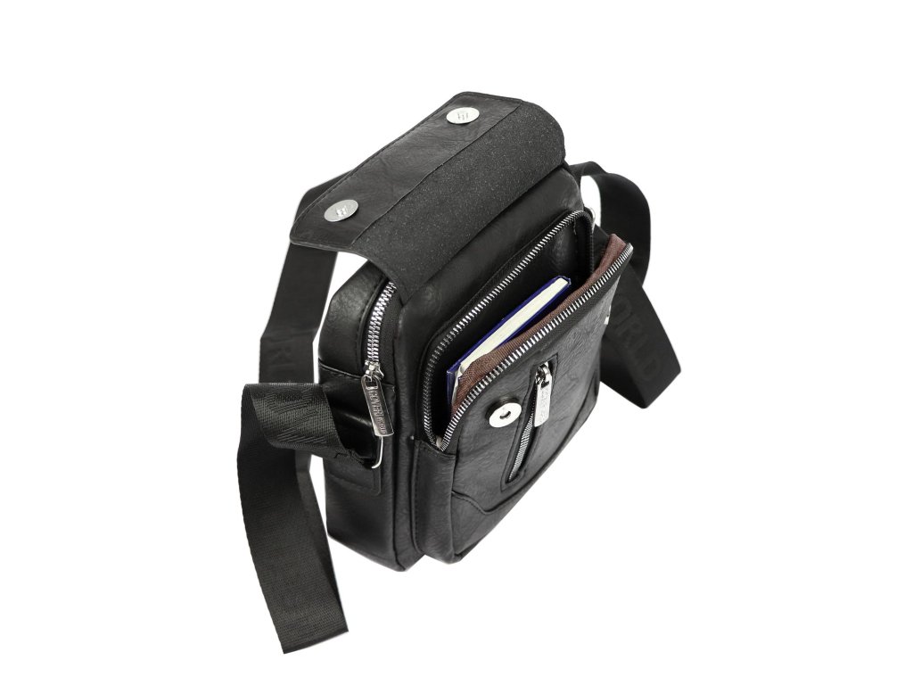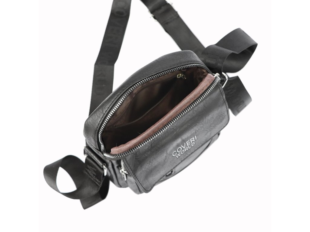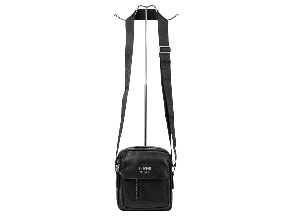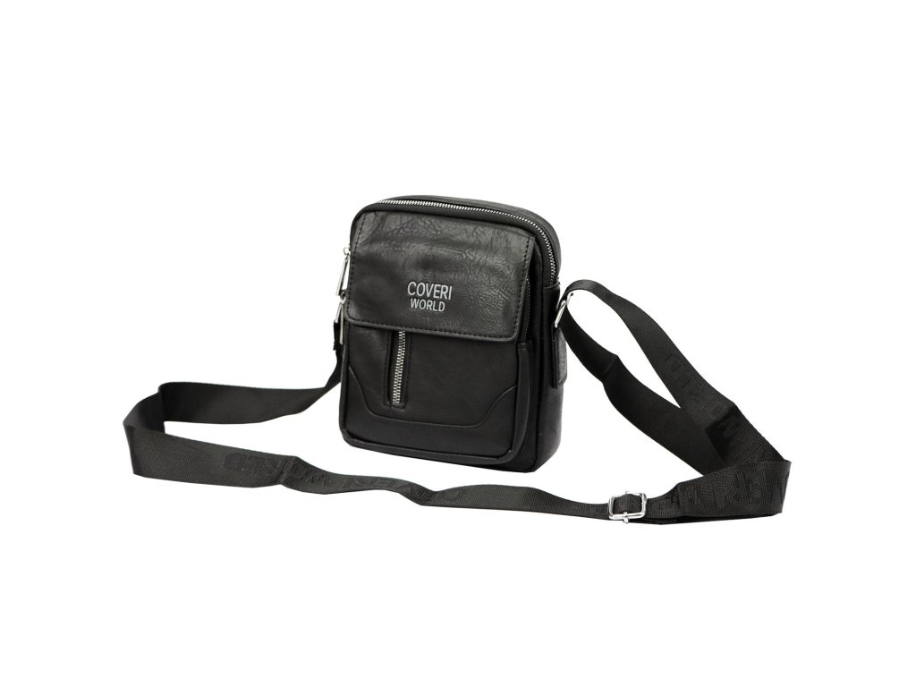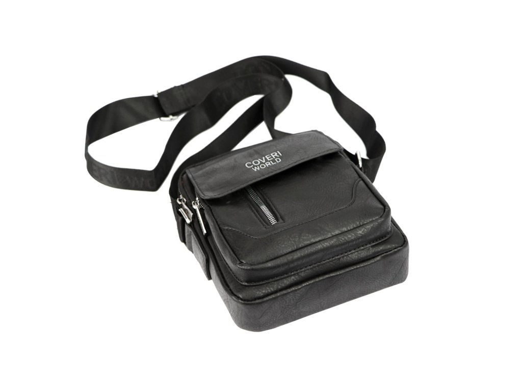 Stylová pánská taška přes rameno Coveri černá. Kvalitní umělé kůže. Oblíbená velikost pánské tašky přes rameno crossbody. Dlouhý textilní popruh přes rameno s nastavitelnou délkou.